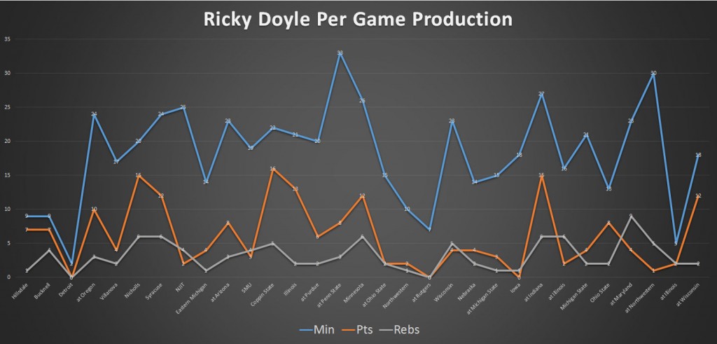 Doyle’s game-to-game production seemed to vary wildly over the course of the season. Here’s a look at his minutes, points and rebounds in each game last season. He showed flashes, but was never able to consistently provide the sort of production that Michigan needed from the position.