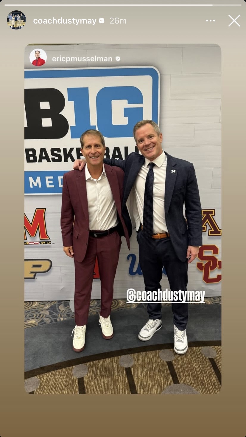 2025-26 Season Video: Dusty May at Big Ten Media Day 2025-26 By UMHoops Staff Posted on October 9, 2025 Share Tweet Print Email Dusty May met with reporters in Chicago at Big Ten Media Day on Thursday afternoon. Related Items:Big Ten Media Day 2025-26, Dusty May PrintFriendly Share Tweet Print Email Notable Replies Hugh_Jass October 9, 2025 Dusty is just pure class - grateful he coaches at Michigan - GO BLUE Reply adamsmit86 October 9, 2025 That means a lot coming from you, Hugh Jass Reply adamsmit86 October 9, 2025 IMG_0605826×1467 204 KB Nice of Dusty to take a picture with a fan at media day Reply DMB43 October 9, 2025 Am I the only Muss fan/supporter on the forum? Reply MTung October 9, 2025 YES…. unless @DMB_Dad ? Reply Discuss the Article 1 more reply