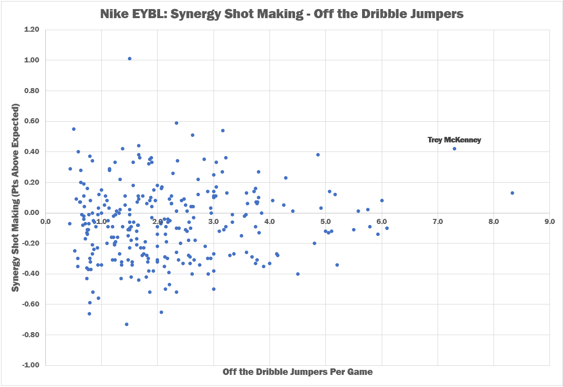 It wasn’t just a hot shooting summer, either. The previous year (while still playing 17U), McKenney graded out in the 91st percentile in off-the-dribble volume and 87th percentile in efficiency.
