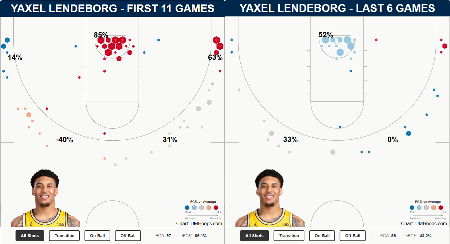 The 3-point shooting will come and go as the year progresses, but the finishing is the notable number. Lendeborg was shooting 85% at the rim compared to just 52% over the last six games.