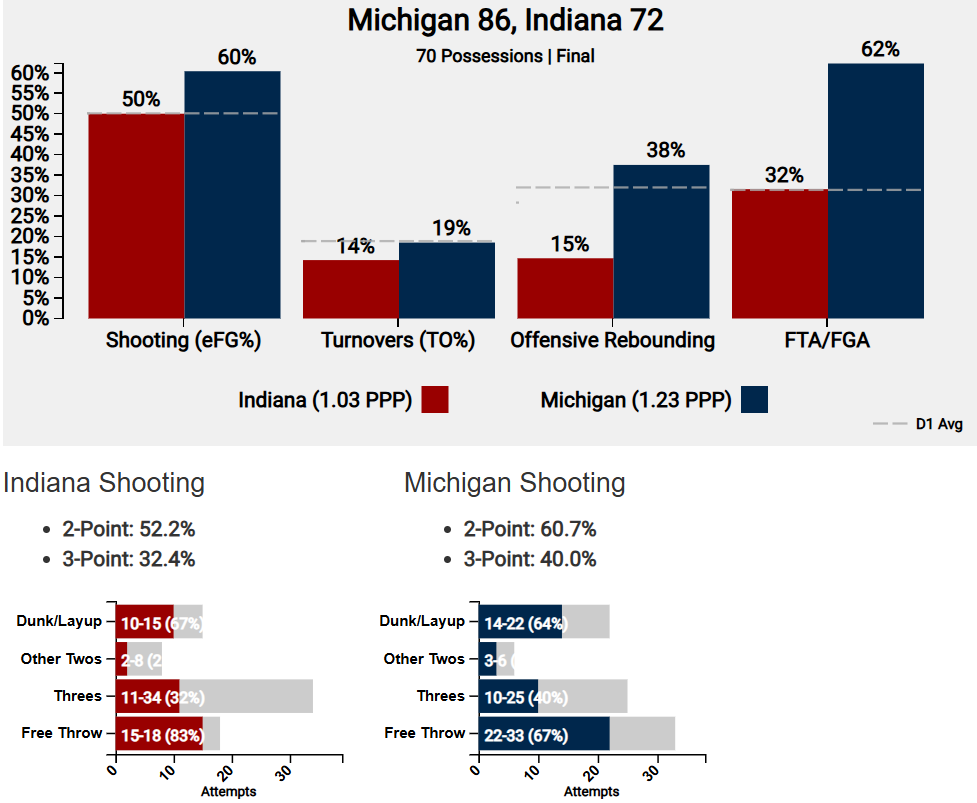 Less similar to their win in Eugene, the Wolverines can thank their defense for keeping Indiana at bay toward the end of the second half. The Hoosiers missed two of their last six shots, and Michigan returned to the intensity it came out of the gate with.