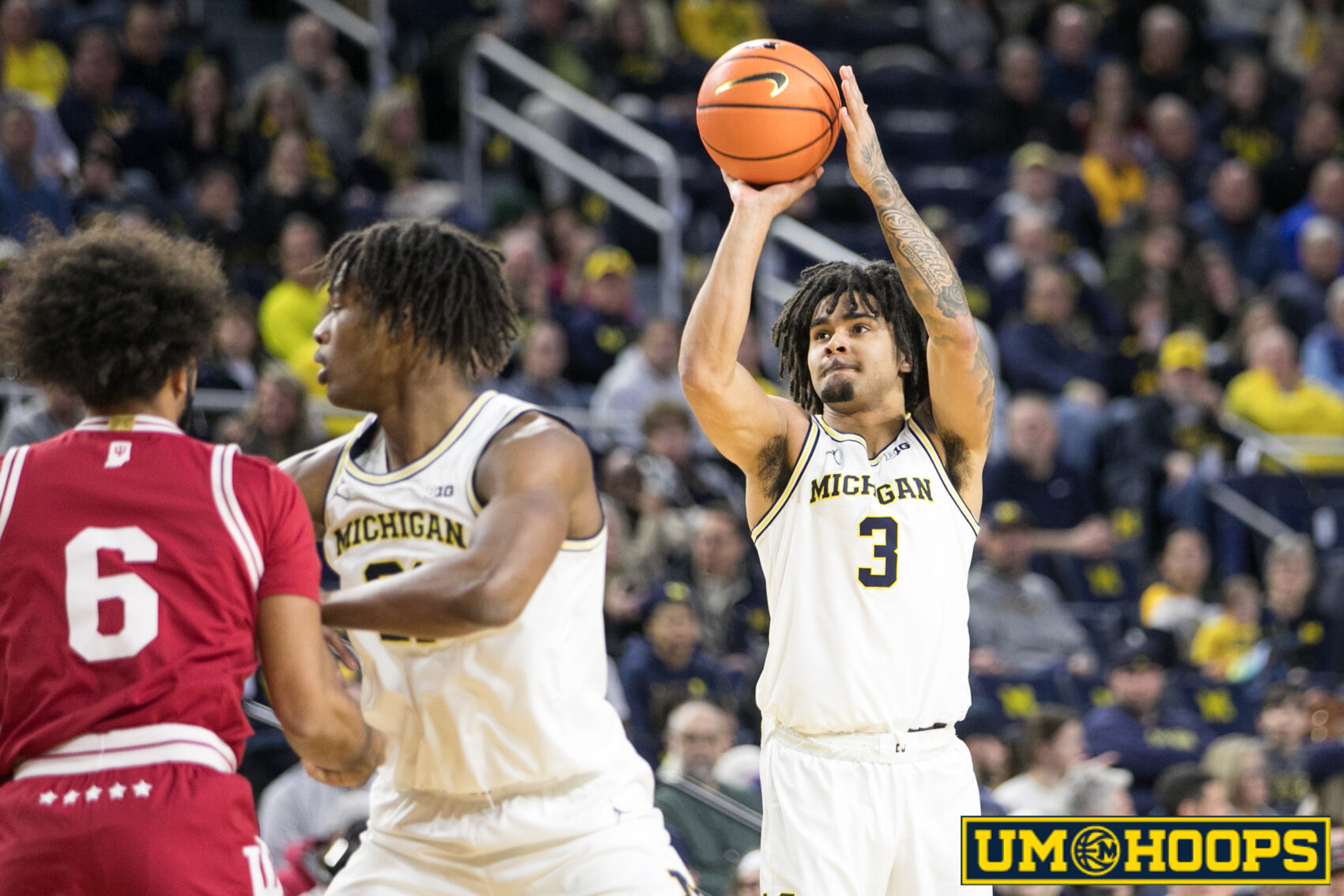 The Wolverines built their lead on defense, forcing the Hoosiers into stagnant, empty possessions that gobbled up the shot clock and had Crisler Center rocking. In the first four minutes of the game, there were several Indiana possessions that ended in missed threes and brought Michigan’s bench to its feet.