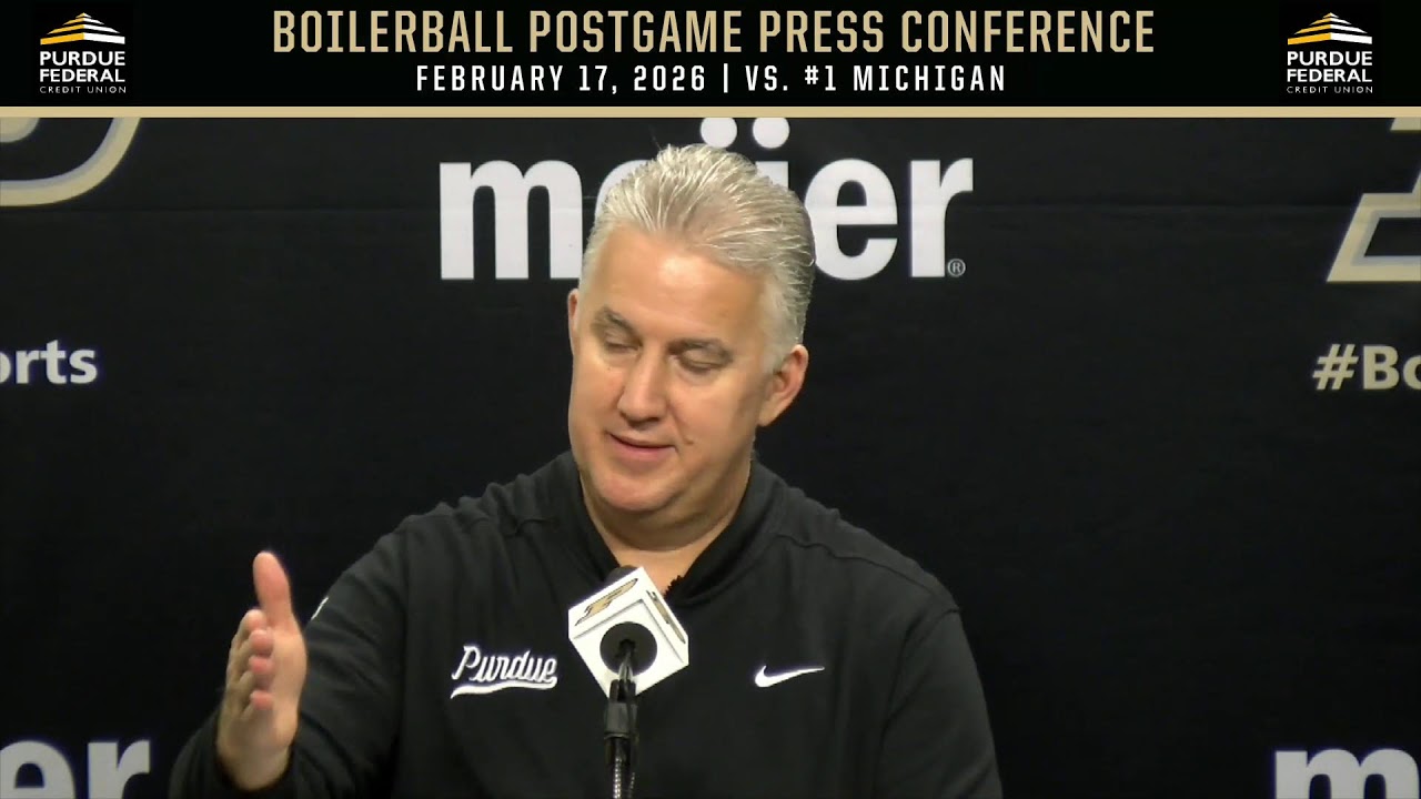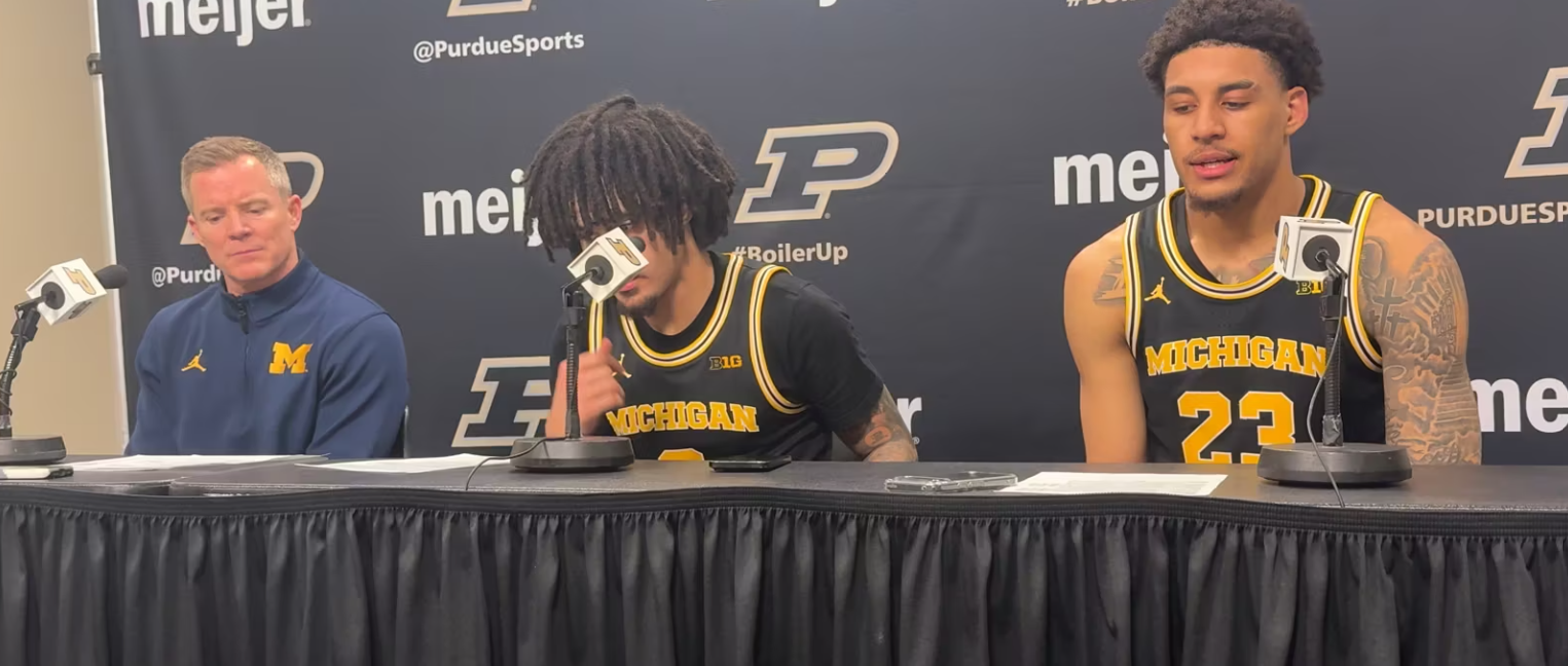 Dusty May, Elliot Cadeau and Yaxel Lendeborg met with the media after Michigan’s win at Mackey Arena.
