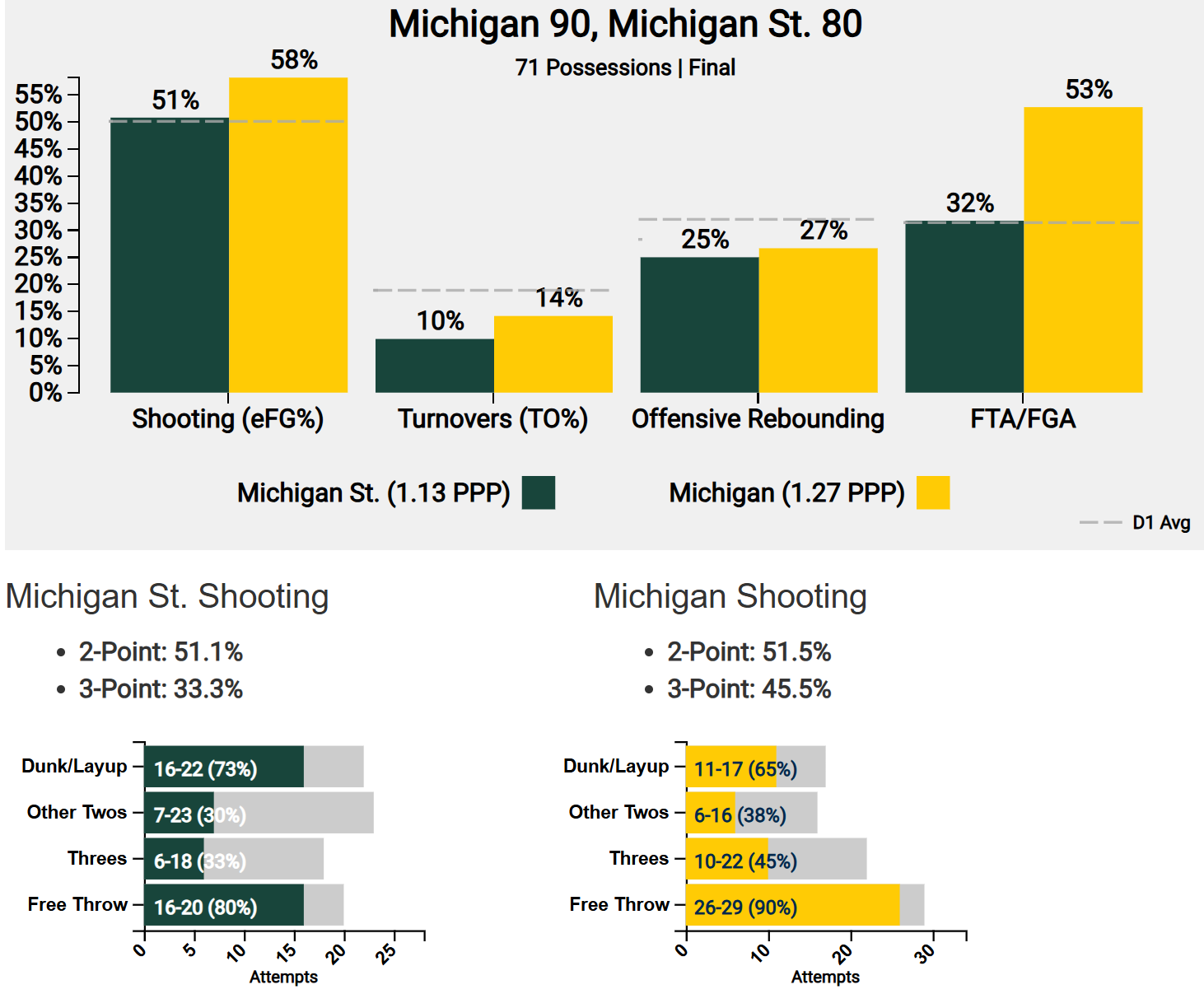 Izzo says Michigan shot “like 100 FTs”. They shot 29 FTs to Sparty’s 20. 10 of those FTs came in the final minute of the game when Sparty was intentionally fouling to prolong the game.