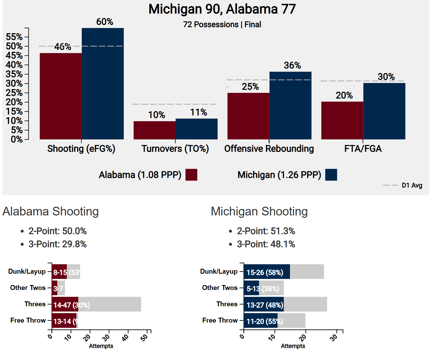 Everything was exactly as advertised. Alabama is known for pushing the pace and shooting a high volume of 3-pointers, and it did exactly that. But Michigan followed along, frequently pushing in transition after a miss or a make to set up its sets as quickly as possible.