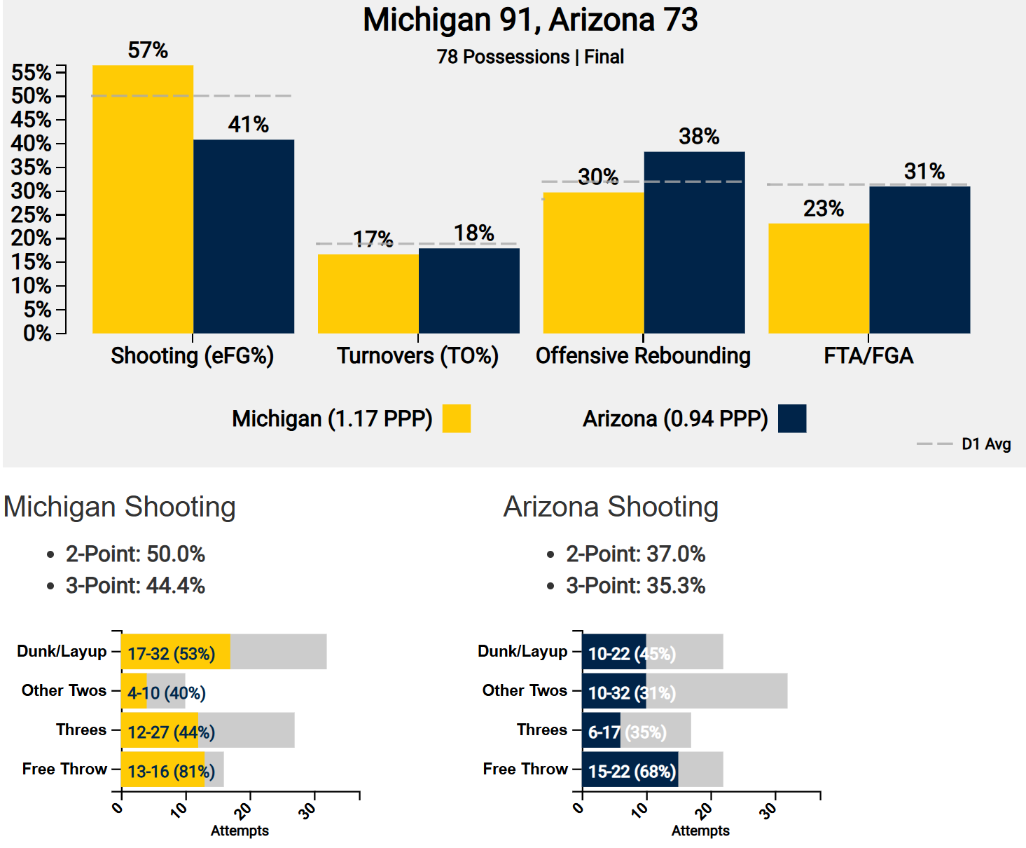Even without their best guy on the floor, the Wolverines looked more than capable of winning it all. Michigan won the paint battle on both ends of the floor, made more than enough threes to stay ahead and didn’t exhibit any major dips throughout forty minutes.