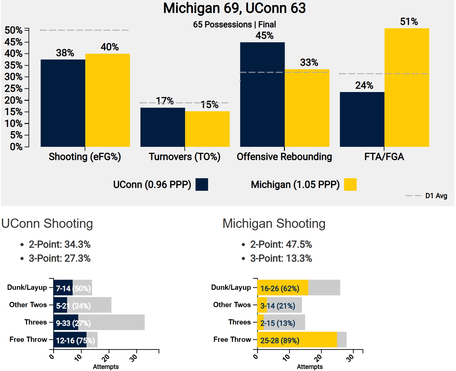 If you would’ve told Michigan fans the Wolverines would be up despite those numbers, it would sound impossible. But Michigan kept up its end of the deal on the other end of the floor, played UConn at its own game, and edged out the Huskies in a slugfest.