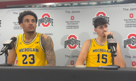 Dusty May, Aday Mara and Yaxel Lendeborg met with the media after Michigan’s blowout win in Columbus.