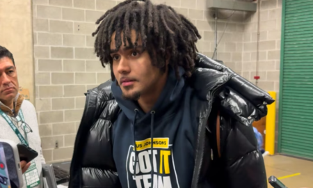 Yaxel Lendeborg and Elliot Cadeau met with assembled media outside the locker room after Michigan’s road win at Michigan State.