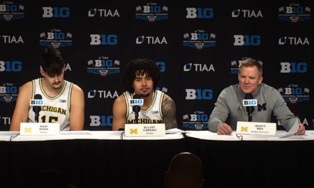 Dusty May was joined on the podium by Elliot Cadeau and Aday Mara after Michigan’s Big Ten Tournament quarterfinal win over Ohio...